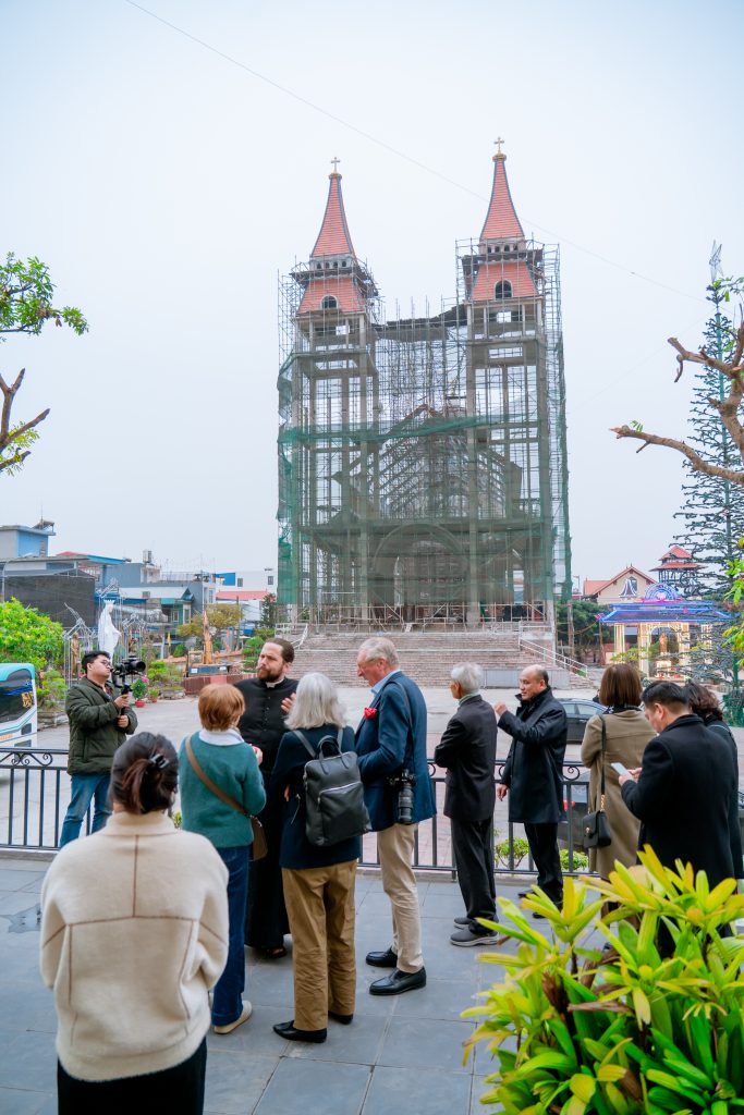 Cuối buổi chiều, đoàn di chuyển về Hải Phòng, đến Nhà thờ Giáo xứ Xâm Bồ – nơi đang xây dựng một công trình nhà thờ mới do Kiến trúc sư Anton Nguyễn Việt Tùng, Trưởng ban Sự kiện Hội DNCG Hải Phòng, thiết kế. Tại đây, đoàn được giới thiệu về lịch sử hình thành giáo xứ, đời sống đức tin của cộng đoàn, cũng như định hướng kiến trúc của công trình mới– một sự kết hợp hài hòa giữa mỹ học, công năng và chiều sâu thiêng liêng.